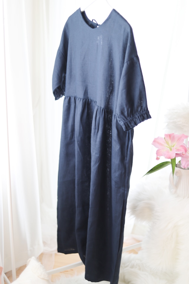 2WAYで楽しめる、フロント&バックデザイン ボタンを前にすればクラシカルで上品な印象に。 ラウンドネックを前にすれば、すっきりとした大人の雰囲気に。 その日の気分やシーンに合わせて、前後を変えて楽しめる2WAYデザインです。 空気をまとう、軽やかなAラインシルエット ふんわりと広がるAラインが、歩くたびに美しいドレープを生み出し、 優雅で女性らしい印象を演出します。 体型を選ばず、ゆったりとした着心地で、日常にやさしく寄り添う一枚です。 ディテールで魅せる、洗練された袖デザイン ふっくらとしたボリューム袖がフェミニンな空気感を纏い、 袖口のカフスが全体を引き締め、洗練された印象をプラス。 動きの中に、静かな華やかさを添えてくれます。 サイズ: S・M Sサイズ:(身長155cm~165cm) バスト: 92cm ウエスト: 102cm 肩幅: 41cm 着丈: 127cm 袖丈: 53cm 重さ: 約 463g Mサイズ(身長158cm~170cm) バスト: 95cm ウエスト: 105cm 肩幅: 44cm 着丈: 130cm 袖丈: 54cm 重さ: 約 490g ※生地の特性により、生産の過程で多少の誤差が生じることがあります。 バスト ウエス 肩幅 着丈 袖丈 重量 身長 サイズ:S 92 102 51 122 45 522g 152cm~160㎝ サイズ:M 95 105 53 127 46 550g 158cm~165cm color: Sakura Pink Lavender Purple Deep Sea Navy Blue こんな方におすすめ ✔︎ 自然素材の心地よさを大切にしたい ✔︎ 体を締め付けず、リラックスしたおしゃれを楽しみたい ✔︎ シンプルだけど、品のあるワンピースを探している お手入れ方法 ✔︎水温30°以下に手で洗いお勧め、 洗濯機OK(ネット使用推奨)1分間前後脱水 ✔︎自然乾燥がベスト(リネンの風合いを活かすため) ✔︎アイロンは低温で(リネン特有のシワ感を楽しむのも◎) このワンピースは、ただ着るだけでなく、毎日の暮らしを豊かにしてくれる一着です・風をまとうような軽やかさと、時間とともに深まるリネンの風合いを、ぜひお楽しみください。