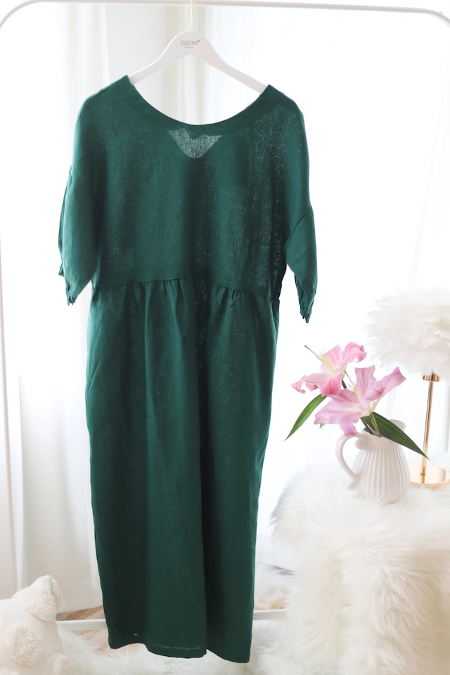 ゆったりとしたシルエットが美しく、どんな体型の方にも自然に馴染むデザインです。 オーバーカーブのカッティングが、動くたびに優雅なラインを描き、女性らしい柔らかさを引き立てます。 リラックス感がありながらも、シンプルな中に洗練されたディテールを散りばめた一着です。 日常にも特別なシーンにも寄り添う、リラックス感と上品さを兼ね備えたワンピース。 前面には繊細なタックデザインを施し、ナチュラルな立体感を演出。 バックには小さめのリボンをあしらい、どの角度から見ても美しいシルエットを叶えます。 肩のラインはほどよくフィットしつつ、全体のゆとりが体のラインを優しく包み込みます。 素材と機能: 100%リネン素材(天然繊維・通気性・吸湿性・速乾性に優れた高機能素材) 肌に優しく、通気性が良いため、汗をかいてもさらりと快適。 自然なシワ感が美しく、アイロンいらずで気軽に着られます。 ◆高機能性 リネン特有の吸湿速乾性で、暑い季節でも涼やかに過ごせる一枚。 軽やかな着心地で、長時間の着用でもストレスフリー。 ◆重ね着にも最適 ヨガウェアやインナーの上に羽織るだけで、洗練されたレイヤードスタイルが完成。 デザインの特徴: ゆったりとしたAラインで、体型を選ばず美しく見せるシルエット。 繊細なタックデザインが施されたフロント部分が、上品な印象をプラス。 シンプルながらも、女性らしさを引き立てるこだわりのディテール バスト ウエスト 肩幅 着丈 袖丈 重量 身長 サイズS 110 104 124 120 24 463g 152㎝~160㎝ サイズM 116 106 138 124 25 480g 158㎝~165㎝ ※生地の特性により、生産の過程で多少の誤差が生じることがあります。 カラー: ● 深海紺 (Deep Sea Navy Blue) 落ち着きと知的な印象を与えるディープネイビー。 深みのある色合いが、シンプルなデザインをよりエレガントに演出。 ● 森林緑 (Forest Green) ナチュラルな深いグリーンが、落ち着きと知性を感じさせる一枚。 シンプルなシルエットでも、こなれた雰囲気を演出できるカラー。 ● 雪白 (Snow White) クリーンでピュアな印象のスノーホワイト。 リネンの自然なシワ感が、シンプルながらもナチュラルな美しさを際立たせる。 こんな方におすすめ ✔︎ 自然素材の心地よさを大切にしたい ✔︎ 体を締め付けず、リラックスしたおしゃれを楽しみたい ✔︎ シンプルだけど、品のあるワンピースを探している お手入れ方法 ✔︎水温30°以下に手で洗いお勧め、 洗濯機OK(ネット使用推奨)1分間前後脱水 ✔︎自然乾燥がベスト(リネンの風合いを活かすため) ✔︎アイロンは低温で(リネン特有のシワ感を楽しむのも◎) このワンピースは、ただ着るだけでなく、毎日の暮らしを豊かにしてくれる一着です・風をまとうような軽やかさと、時間とともに深まるリネンの風合いを、ぜひお楽しみください。